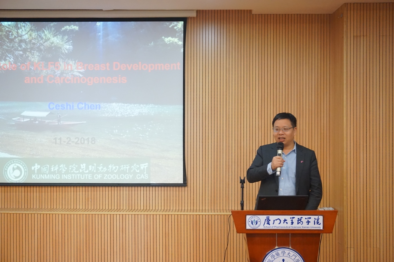 11月2日上午,中国自然科学基金委“杰出青年”获得者,现任中国科学院昆明动物研究所肿瘤生物学课题组长的陈策实研究员应邀莅临福建省药物新靶点研究重点实验室,作了题为“The role of KLF5 in breast development and carcinogenesis”的学术讲座。重点实验室刘文教授主持了讲座。刘教授首先对陈策实研究员的到来表示了诚挚的感谢和热烈的欢迎,继而介绍了其取得的一系列重要研究成果。实验室主任张晓坤教授等实验室师生聆听了讲座。