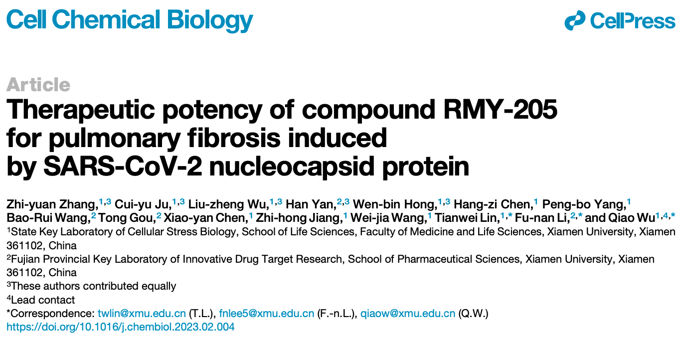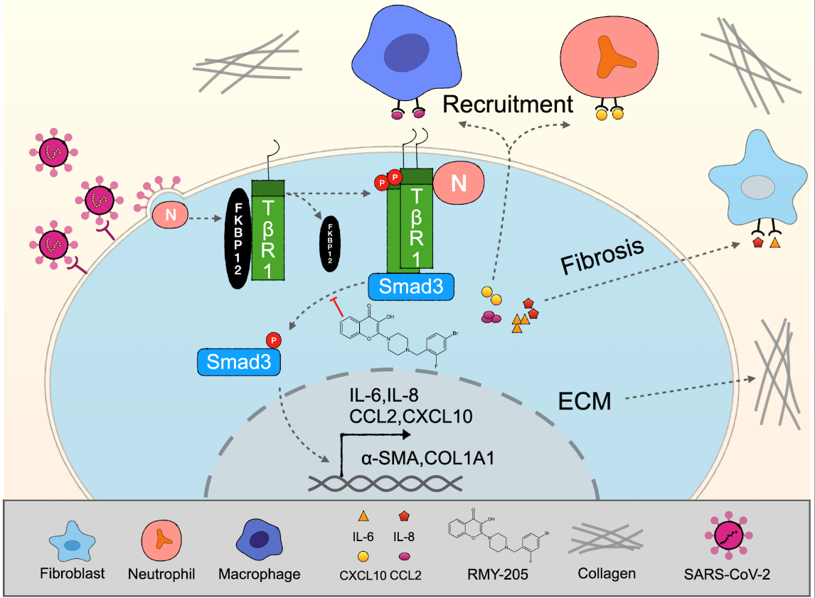 严重急性呼吸系统综合征冠状病毒2型(SARS-CoV-2)是导致新型冠状病毒肺炎(COVID-19)的主要病原体,常引起多器官功能衰竭等严重并发症,特别是肺实质病变、肺泡腔渗出、肺间质纤维化等,可导致患者肺功能不良,严重影响患者的生活质量。近日,福建省药物新靶点研究重点实验室李福男副教授与厦门大学生命科学学院吴乔教授、林天伟教授团队合作,发现SARS-CoV-2引发肺纤维化的全新分子机制,并筛选出一种以Smad3为靶点,能有效干预肺纤维化的小分子化合物RMY-205,为治疗SARS-CoV-2引发的肺纤维化提供了新思路和新颖的先导化合物。该研究成果已申请了一项国家发明专利,并以“Therapeutic potency of compound RMY-205 for pulmonary fibrosis induced by SARS-CoV-2 nucleocapsid protein ”为题发表在Cell Chemical Biology杂志。