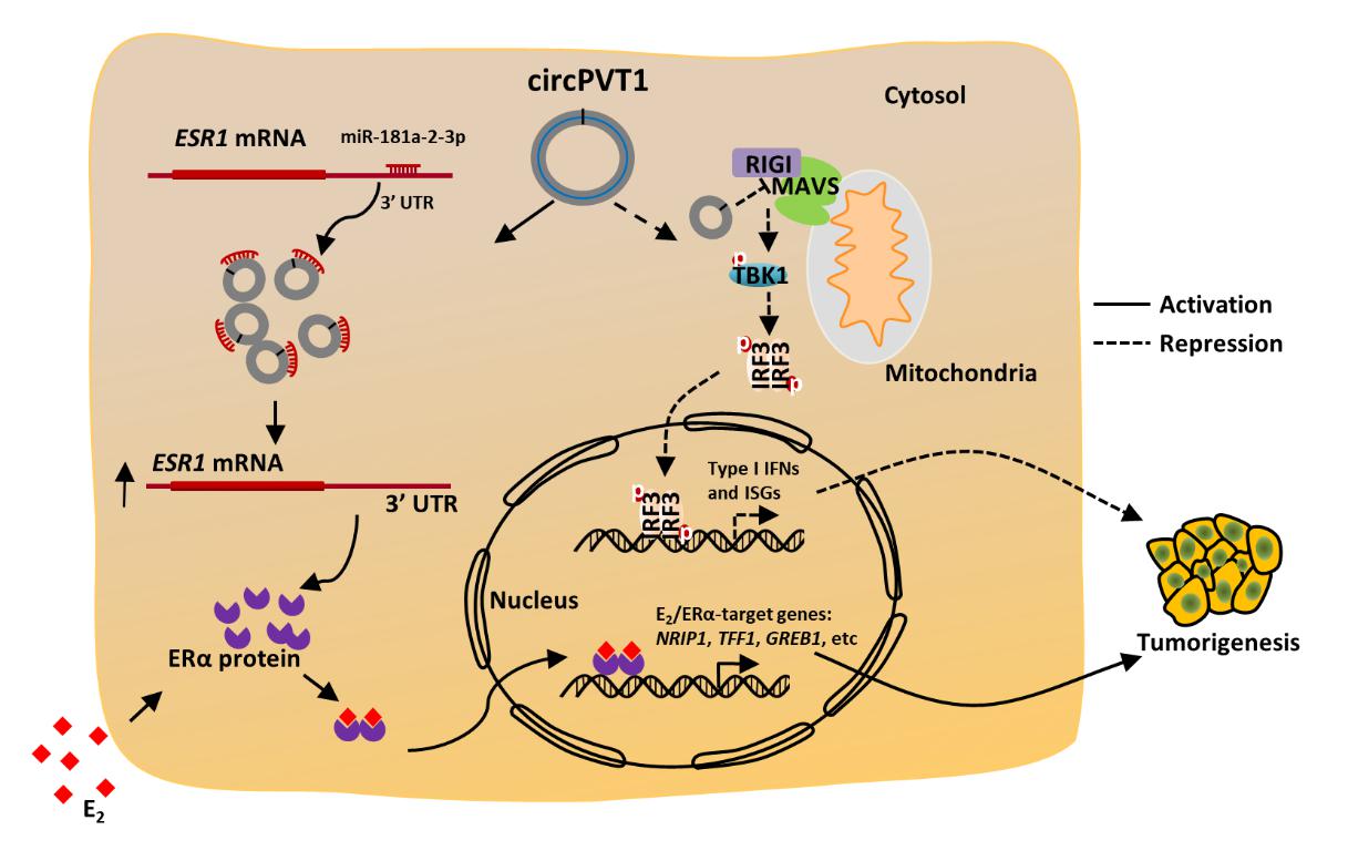 模式图:CircPVT1竞争性结合miR-181a-2-3p促进ESR1表达以及结合MAVS抑制I型干扰素通路激活,促进ER阳性乳腺癌发生发展的双重作用机制。