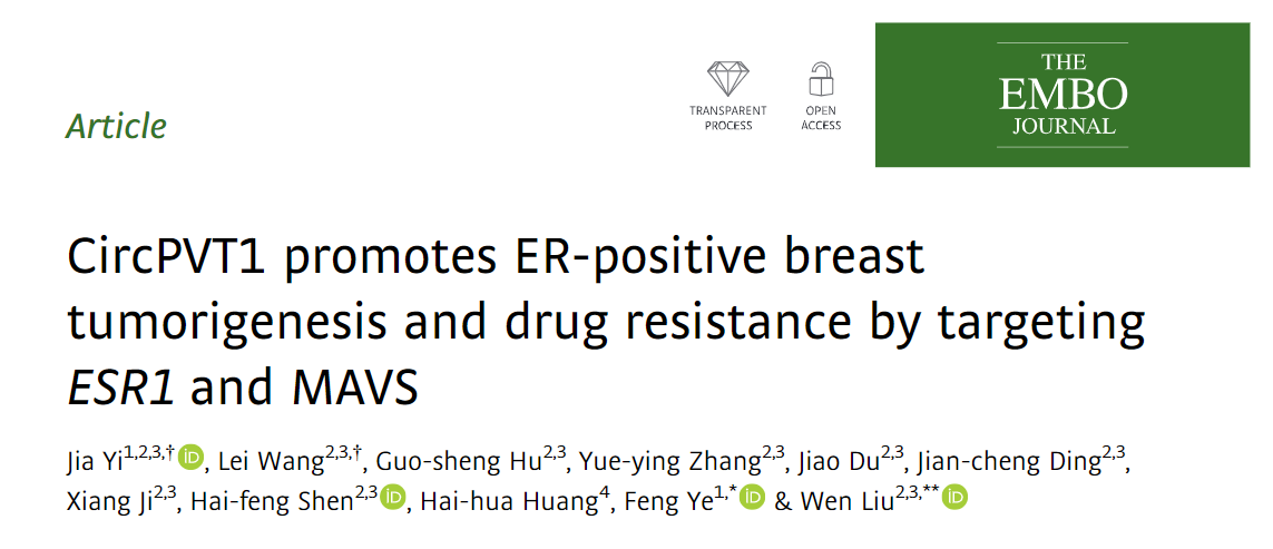 2023年4月3日,福建省药物新靶点研究重点实验室刘文教授课题组与厦门大学附属第一医院叶峰教授课题组联合在The EMBO Journal杂志上发表题为“CircPVT1 promotes ER-positive breast tumorigenesis and drug resistance by targeting ESR1 and MAVS”的研究成果。该研究发现,环状RNA circPVT1在乳腺癌中高表达,通过靶向ESR1 mRNA和MAVS蛋白双重作用机制促进乳腺癌发生发展。