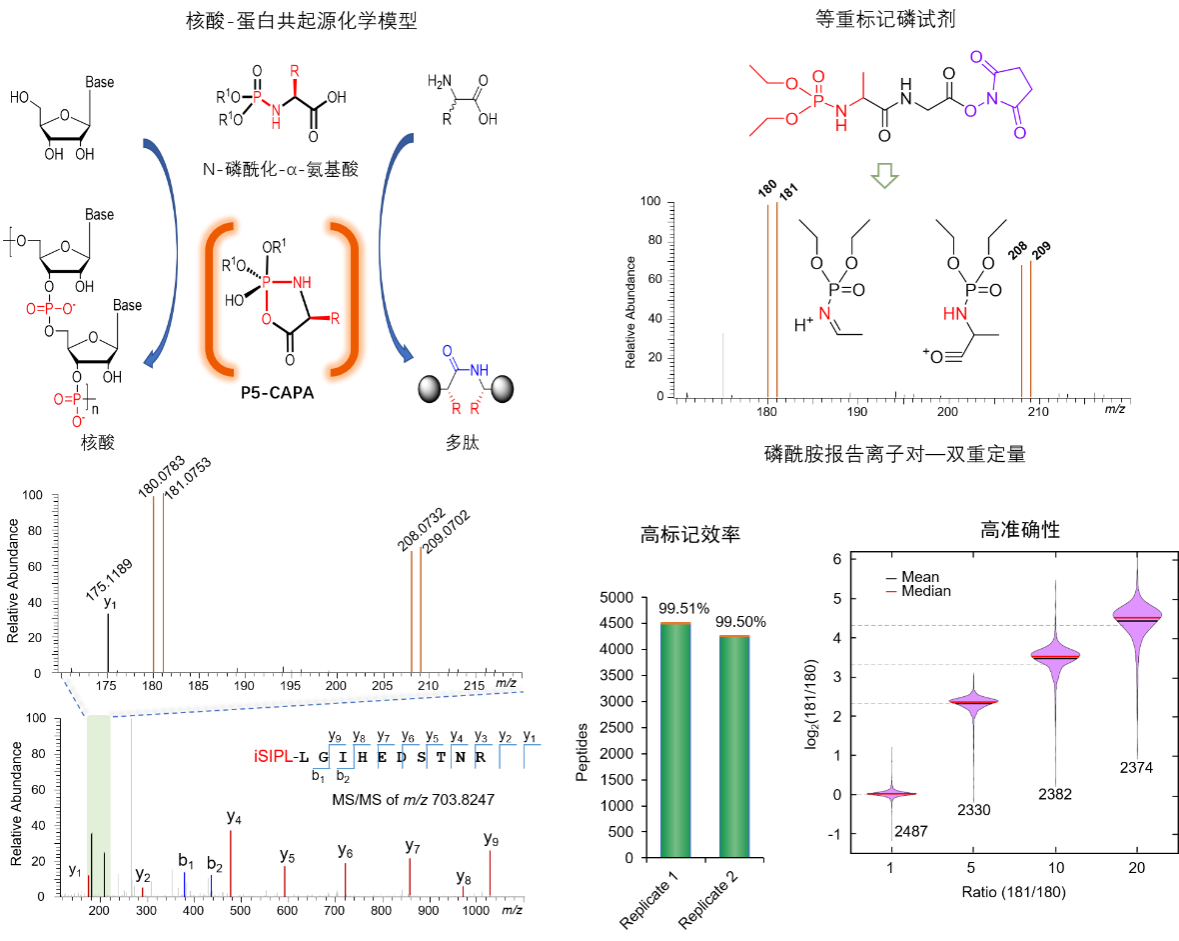 基于质谱技术的蛋白质组学在蛋白质结构与功能研究、生命化学本质的揭示、人类重大疾病的诊断及新药研发等方面提供了重要技术支撑。虽然多种蛋白质定量分析方法相继建立,但蛋白质的精准定量和深度覆盖仍然是当今蛋白质组学研究面临的挑战,特别是在微量蛋白定量分析方面,如单细胞水平蛋白质组学分析、蛋白-蛋白相互作用、蛋白翻译后修饰及临床微量样本分析等,发展高灵敏度蛋白质定性和定量分析组学质谱技术具有重要科学意义。高祥团队通过近十年的联合攻关,研发出一种等重稳定同位素标记磷试剂(iSIPL)蛋白质定量技术,其化学结构源于赵玉芬院士提出的核酸与蛋白共起源N-磷酰化氨基酸化学模型,利用了中性磷酰基团高质子亲和能特性,在较低裂解能量下产生具有P-N化学键独特结构的磷酰胺报告离子对(m/z 180/181和m/z 208/209),具有双重定量功能,为蛋白质的高灵敏精准定量提供了磷化学新策略。