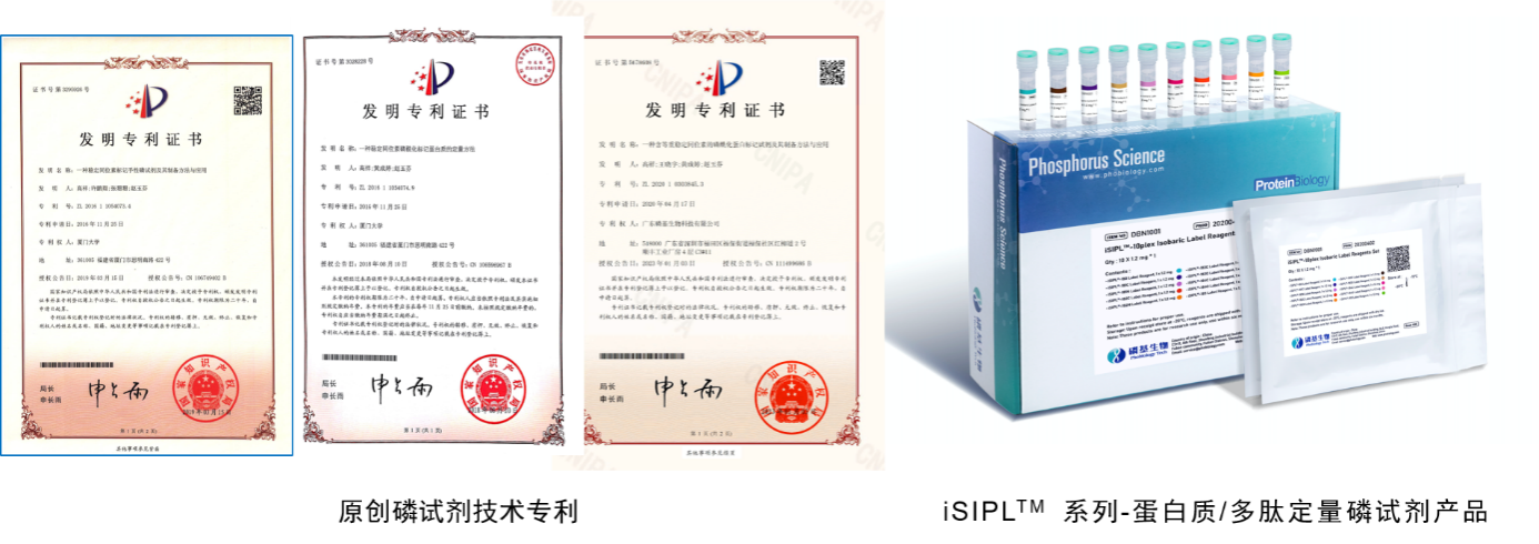 基于iSIPL磷试剂结构可以实现不同位置稳定同位素的高效引入,为开发多标定量磷试剂提供了优越的结构基础,且极大降低了商品化等重标记试剂高昂的价格成本。本论文相关研究成果已获授权国家发明专利三项,国际PCT专利一项,均已实现技术转化,并基于原创磷试剂技术成功研发系列磷试剂产品,打破国外相关同类型试剂近二十年的市场垄断。iSIPL等重标记磷试剂基于N-磷酰化氨基酸的原创磷化学理论体系,实现微量蛋白组样品的高灵敏定性和精确定量质谱分析,在生命定量分析、新药物研发及临床疾病诊断等研究领域中具有广阔的应用前景。