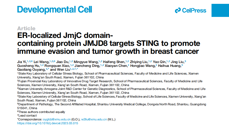 2023年4月12日,福建省药物新靶点研究重点实验室刘文教授研究团队与厦门大学生命科学学院欧阳高亮教授研究团队于Developmental Cell在线发表题为“ER-localized JmjC domain-containing protein JMJD8 targets STING to promote immune evasion and tumor growth in breast cancer”的研究成果。揭示了含有JmjC结构域的蛋白家族成员JMJD8定位于内质网,并且通过干扰STING-TBK1的相互作用抑制下游I型干扰素信号通路激活,促进肿瘤免疫逃逸的功能和分子机制。同时发现敲低JMJD8能有效增强化疗和免疫检查点抑制剂对乳腺癌的治疗效果。