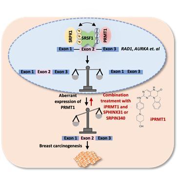 模式图:PRMT1介导的SRSF1精氨酸甲基化在基因可变剪接调控和乳腺癌细胞生长中的作用机制和靶向干预研究