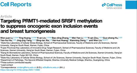 11月7日,福建省药物新靶点研究重点实验室刘文教授研究团队与厦门大学生命科学学院邓贤明教授研究团队合作于Cell Reports在线发表题为“Targeting PRMT1-mediated SRSF1 Methylation to Suppress Oncogenic Exon Inclusion Events and Breast Tumorigenesis”的研究成果。该研究阐述了蛋白精氨酸甲基转移酶PRMT1甲基化剪接因子SRSF1调控基因可变剪接的功能和分子机制,基于该分子机制,研究团队进一步筛选获得特异性靶向PRMT1的小分子抑制剂iPRMT1。iPRMT1单独使用对乳腺癌的生长起到有效抑制作用,联合SRSF1的激酶抑制剂(SPHINX31或SRPIN340)起到协同效果。该研究为以PRMT1为靶点的抗肿瘤药物开发,也为可变剪接紊乱所诱发的肿瘤治疗提供了新的研发角度和策略。这是继刘文教授团队在2021年揭示I型、II型和 III型PRMT介导的甲基化修饰网络及其协同调控基因剪接和促癌机制(Nature Communications,2021)之后,在精氨酸甲基化及其抑制剂开发领域的又一个重要的发现。
