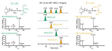代谢物异构体包含结构异构体和立体异构体。在生物系统中,分子式相同但化学结构不同的结构异构体分子和立体异构分子是普遍存在的,它们各自发挥着独特的功能。氨基酸、小肽、脂类、碳水化合物连接异构体和修饰的核苷酸等结构异构体在初级代谢的特定条件下发挥着重要作用。同时,生物的同手性是地球上生命的一个复杂特征。代谢物的手性与多种代谢性疾病密切相关,包括癌症、糖尿病和神经退行性疾病等。生物进化通过产生了氨基酸消旋酶和D-氨基酸氧化酶等特异性酶,用于手性氨基酸的高效合成和选择性降解。在这种情况下,一个分子式可以产生多种的代谢异构体化学结构,扩展了多维化学空间,具有更多的生物学功能。然而,在非靶向代谢组学分析中,由于具有相似的化学结构和理化性质,区分含氨基代谢物的构造异构体和对映体仍然是一个很大的挑战。