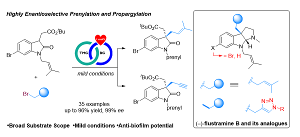蛋白质的异戊(二)烯基化修饰是一类非常重要的不可逆翻译后修饰,该亲脂性修饰能够调控蛋白质之间的相互作用,提高蛋白质靶向和结合细胞膜的能力。此外,异戊(二)烯基官能团也广泛存在于天然产物的分子结构中,如生物碱(−)-flustramine B、黄酮和类黄酮等,通过增加其亲脂性来提高异戊烯基化天然产物的生物活性。因此,如何将异戊烯基以及异戊烯二基如香叶基等官能团通过不对称催化合成的方式引入到底物上,并实现重要天然产物的全合成,具有重要的科学价值。