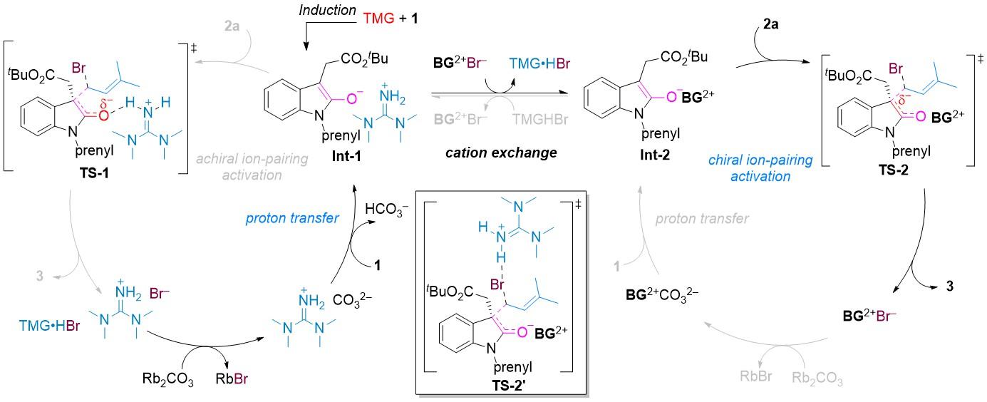 近日,福建省药物新靶点研究重点实验室、厦门大学药学院教授宗利利团队首次报道了手性双胍阳离子和非手性布朗斯特碱1,1,3,3-四甲基胍(TMG)在3-取代氧化的不对称异戊烯基化、香叶基化、炔丙基化和苄基化反应中的协同催化作用,并通过机理研究证实了质子化的1,1,3,3-四甲基胍(TMG)将以非手性阳离子的形式存在于催化体系,通过助力无机碱的相转移过程以及通过氢键作用活化亲电试剂溴代烷烃等作用模式来增强反应的速率和对映选择性。采用该新型“协同催化”体系,团队在温和条件下实现了对一系列3,3-二取代氧化吲哚关键手性中间体的高效构筑,并将其成功地应用于海洋来源天然产物(−)-flustramine B、(−)-debromoflustramine B及其三唑类衍生物的全合成上,同时初步揭示了这些化合物的抗生物膜活性。这一研究成果显示出“手性阳离子对催化剂-非手性布朗斯特碱”协同催化方法在不对称催化领域广泛的应用潜力,同时为进一步开发海洋来源天然产物的新型抗菌药物提供了技术支撑和物质基础。