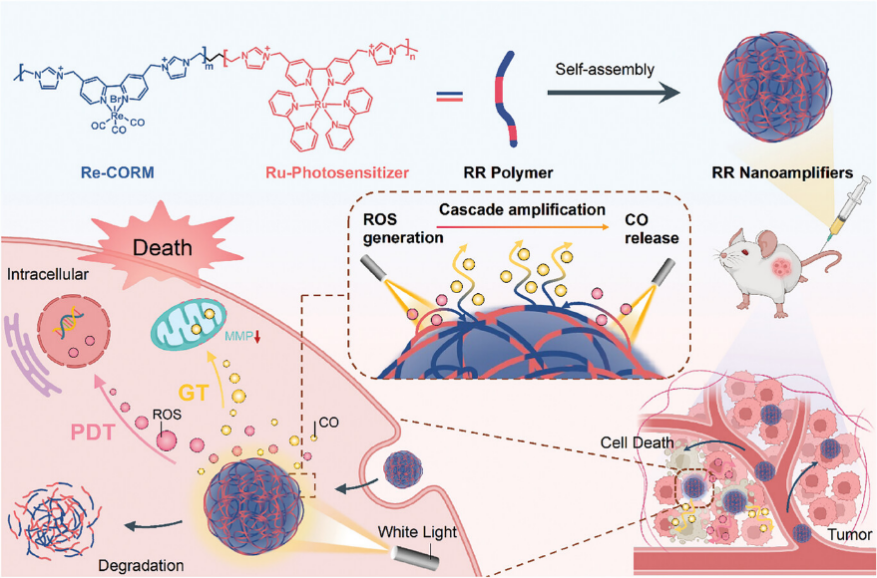 近日,福建省药物新靶点研究重点实验室霍帅东教授和刘爱洁副教授团队在Advanced Science期刊发表了题为“Biodegradable Ruthenium-Rhenium Complexes Containing Nanoamplifiers: Triggering ROS-Induced CO Release for Synergistic Cancer Treatment”的研究论文,报道了一种以钌配合物(Ru-complex)为光敏剂(PS)和铼配合物(Re-complex)作为一氧化碳(CO)释放分子(CORM)的可生物降解共聚物纳米放大器。该纳米放大器能够在光诱导下产生ROS,继而触发CO释放,用于增强抗肿瘤的协同治疗。