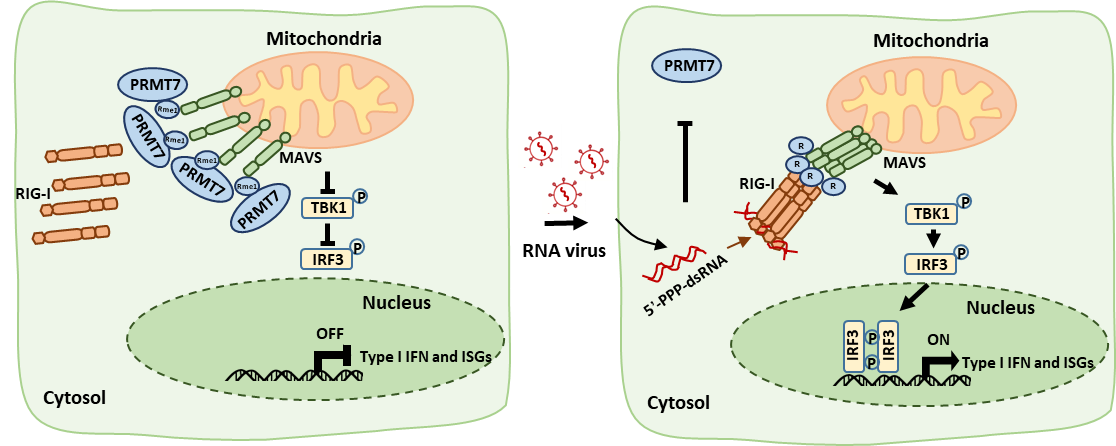 这一研究结果揭示了PRMT7介导的精氨酸单甲基化修饰在调节MAVS介导的抗病毒免疫反应中发挥着关键作用,进一步深化了对抗病毒免疫调控机制的认识。同时,靶向精氨酸甲基化修饰有望为治疗RNA病毒感染提供一种有效的治疗途径。