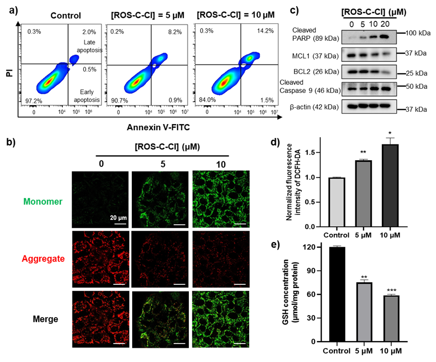 进一步的抗癌机制研究表明:该通道能选择性破坏癌细胞线粒体的跨膜电势,引发线粒体膜去极化,导致细胞内ROS水平显著升高,进而促使线粒体通透性转换孔的开放,释放细胞色素c,加速细胞凋亡。同时,ROS的升高消耗了胞内的谷胱甘肽,削弱了癌细胞的抗氧化防御能力。这项研究不仅拓展了人工H+/Cl-通道的种类和设计思路,为深入理解H+和Cl-的协同跨膜传输机制及通道如何响应外界刺激提供了重要的理论参考,还为开发基于内源性刺激响应的人工离子通道在癌症靶向治疗中的应用提供了新的研究方向。