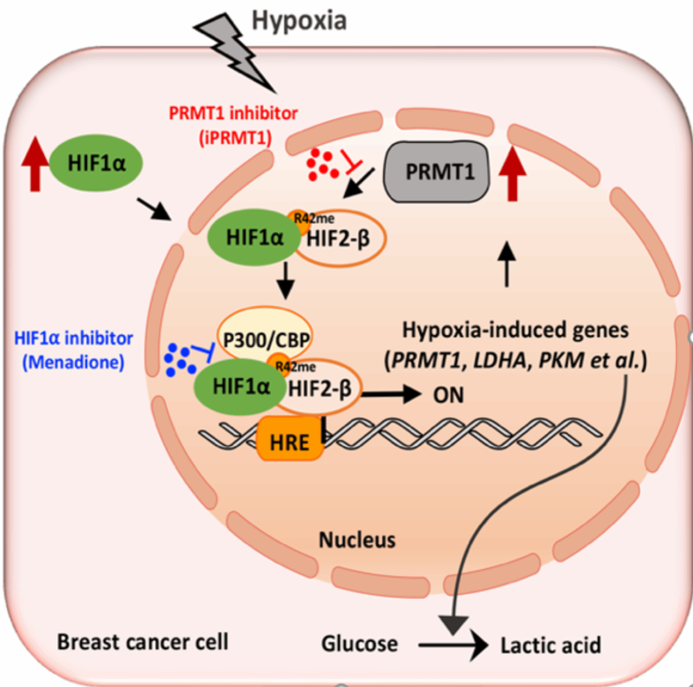 模式图:PRMT1介导的HIF2β甲基化在糖酵解基因表达、代谢重编程及乳腺癌生长中的作用机制和靶向干预研究