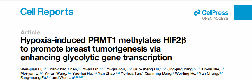 2025年4月1日,福建省药物新靶点研究重点实验室刘文教授团队与合作者于Cell Reports发表题为 “Hypoxia-induced PRMT1 Methylates HIF2β to Promote Breast Tumorigenesis via Enhancing Glycolytic Gene Transcription”的研究成果。该研究揭示,在低氧条件下,PRMT1 是 HIF1α下游靶基因之一,而PRMT1可以正反馈增强 HIF1α 介导的糖酵解基因表达。机制上,PRMT1 通过甲基化 HIF2β的第42位精氨酸促进HIF1α/HIF2β异源二聚体的形成,增强其染色质结合能力及转录活性。基因敲降或药物抑制 PRMT1 (使用课题组前期报道的PRMT1特异性抑制剂iPRMT1,Cell Reports, 2023)可显著降低 HIF2β 甲基化、HIF1α/HIF2β 复合物形成、糖酵解基因表达、乳酸生成及乳腺癌细胞的恶性行为。此外,iPRMT1与 HIF1α/P300 相互作用抑制剂 Menadione(MEN)联合使用可协同抑制乳腺癌细胞生长和肿瘤形成。临床样本分析进一步证实PRMT1 及其介导的 HIF2β 甲基化在乳腺癌组织中相较于正常组织显著升高。这是研究团队继 2023 年揭示 PRMT1 甲基化 SRSF1 调控基因可变剪接促乳腺癌后(Cell Reports, 2023),针对PRMT1促癌机制的又一重要进展:PRMT1通过甲基化HIF2β调控糖酵解基因转录促乳腺癌。