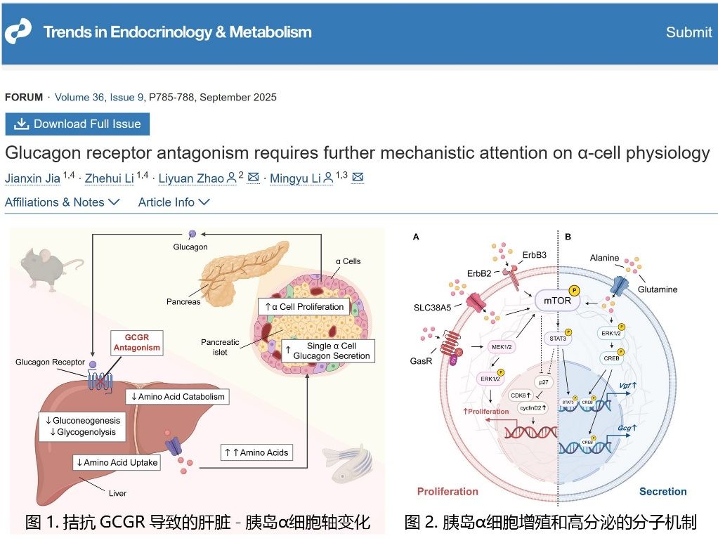 2025年9月9日,福建省药物新靶点研究重点实验室李明玉教授团队受邀在Cell Press旗下内分泌代谢领域期刊Trends in Endocrinology &Metabolism杂志上发表题为“Glucagon receptor antagonism requires further mechanistic attention on α-cell physiology”的论坛综述,论文系统总结了李明玉教授团队及国际同行近年在由胰高血糖素受体(GCGR)信号通路介导的肝脏-胰岛α细胞轴的研究进展,梳理了GCGR拮抗剂与α细胞代谢之间的关系,以及GCGR拮抗剂在糖尿病治疗领域的研究现状与面临的挑战,并在此基础上展望了未来的研究方向。