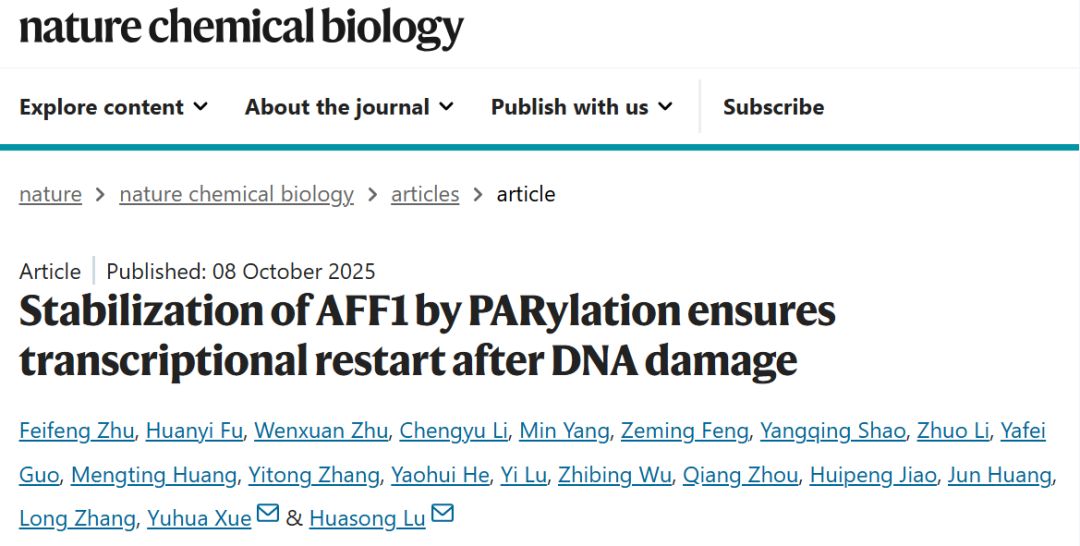 近日,福建省药物新靶点研究重点实验室薛玉花团队联合浙江大学陆华松团队在Nature Chemical Biology杂志在线发表题为“Stabilization of AFF1 by PARylation ensures transcriptional restart after DNA damage”的研究论文。本研究首次阐明 ,PARP1通过一种全新的“PARSTA”机制(PARylation-mediated stabilization,谐音“意面”),主动调控 DNA损伤修复后的转录重启过程。