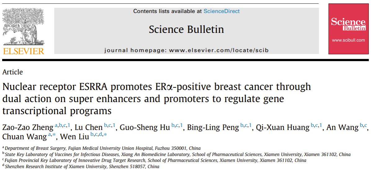 福建省药物新靶点研究重点实验室刘文教授团队联合福建医科大学附属协和医院王川教授团队在Science Bulletin期刊发表封面论文,题为Nuclear receptor ESRRA promotes ERα-positive breast cancer through dual action on super enhancers and promoters to regulate gene transcriptional programs。该研究发现,雌激素相关受体α(ESRRA)不仅能通过结合增强子协同雌激素受体α(ERα)激活雌激素受体靶基因转录,还同时通过结合启动子抑制RNA传感器基因转录,从而抑制I型干扰素及其下游靶基因表达,这种对于不同基因群的正负双重调控机制,为ERα阳性乳腺癌的治疗提供了新的潜在靶点和联合治疗策略。