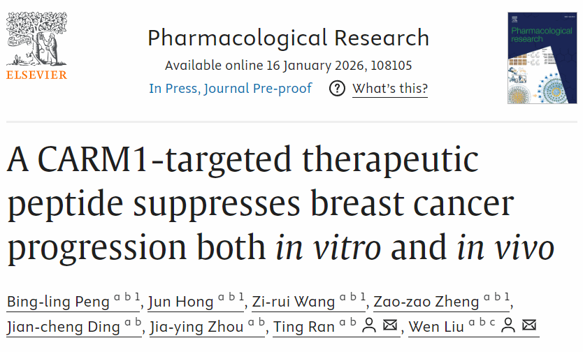 2026年1月16日,福建省药物新靶点研究重点实验室刘文教授团队在Pharmacological Research杂志上在线发表题为“A CARM1-targeted therapeutic peptide suppresses breast cancer progression both in vitro and in vivo”的研究成果,该研究通过对CARM1底物肽的系统筛选获得了特异性靶向CARM1酶活性的新型短肽抑制剂Pi-CARM1,该抑制剂在体内外均表现出良好的抗乳腺癌肿瘤活性。该研究不仅为基于CARM1靶点的抗肿瘤药物开发开辟了新思路,更为乳腺癌的临床治疗提供了一种极具应用前景的治疗策略。